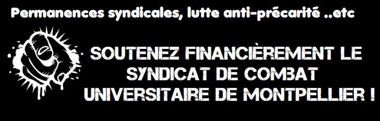On a créé un “Pot commun” sur le web afin d’être soutenus financièrement : N’hésitez pas à donner, et à partager le lien ! Fondé en janvier 2014, le Syndicat de Combat Universitaire de Montpellier (SCUM) défend une nouvelle…