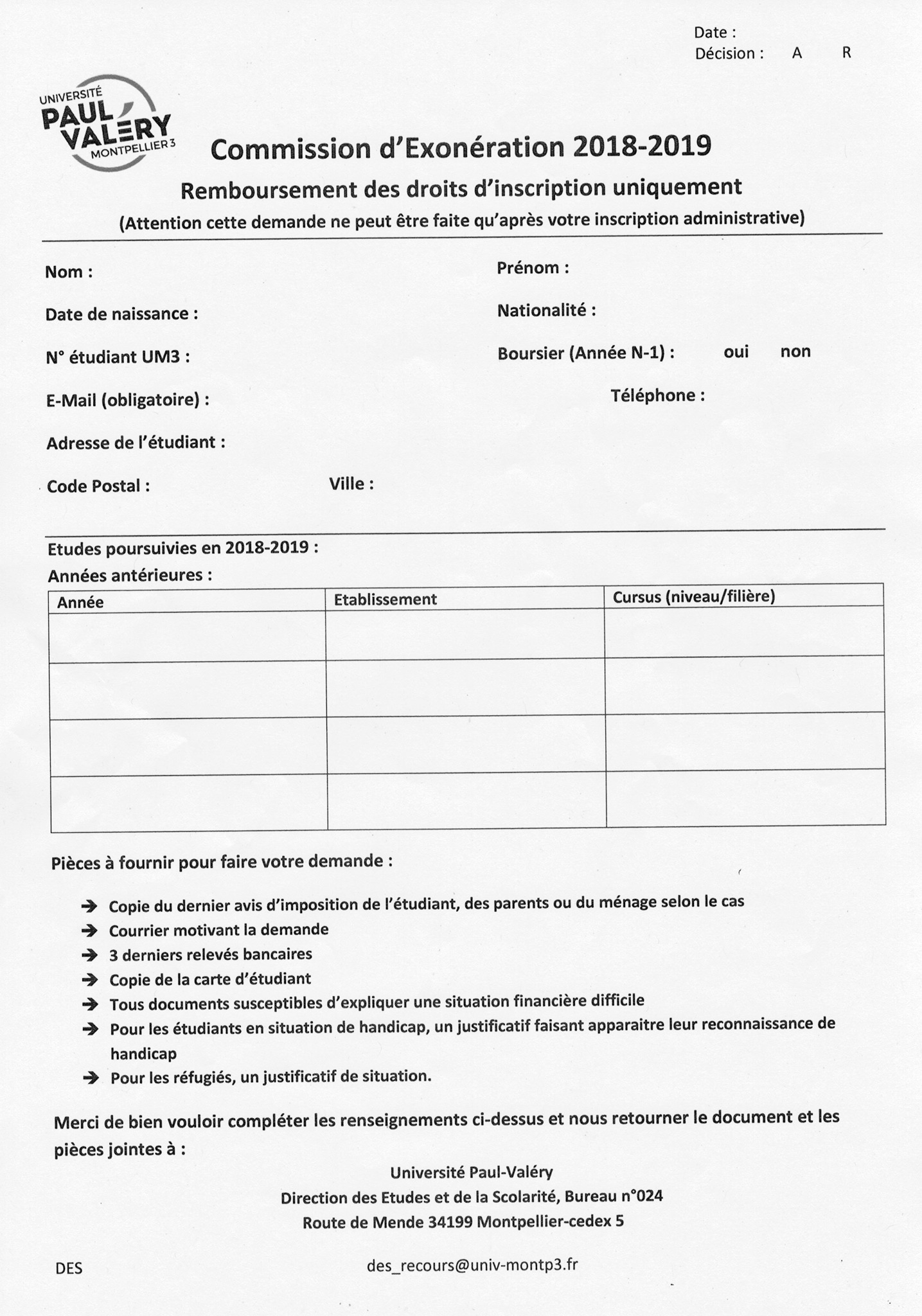 1. […] Comme les années précédentes, nous aidons les étudiants non-boursiers à constituer des dossiers de demandes de remboursement de frais d’inscription auprès de la commission d’exonération des frais d’inscription, qui réformée grâce à l’action des élus SCUM et indépendants sur l’université Paul Valéry. […]