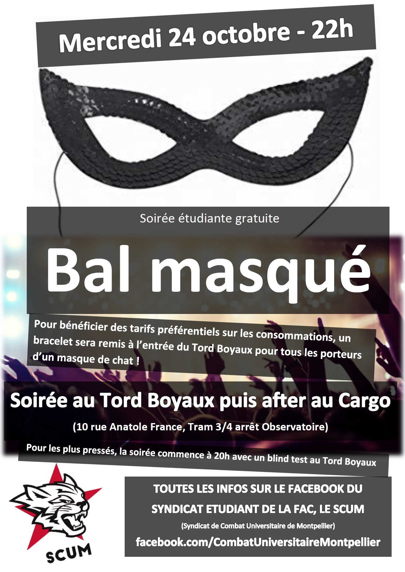 Fidèle à notre engagement d’organiser des évènements festifs gratuits et variés pour que chaque étudiant puisse profiter d’une vie sociale bien remplie, le SCUM (Syndicat de Combat Universitaire de Montpellier) organise mercredi 24 octobre son premier bal masqué !