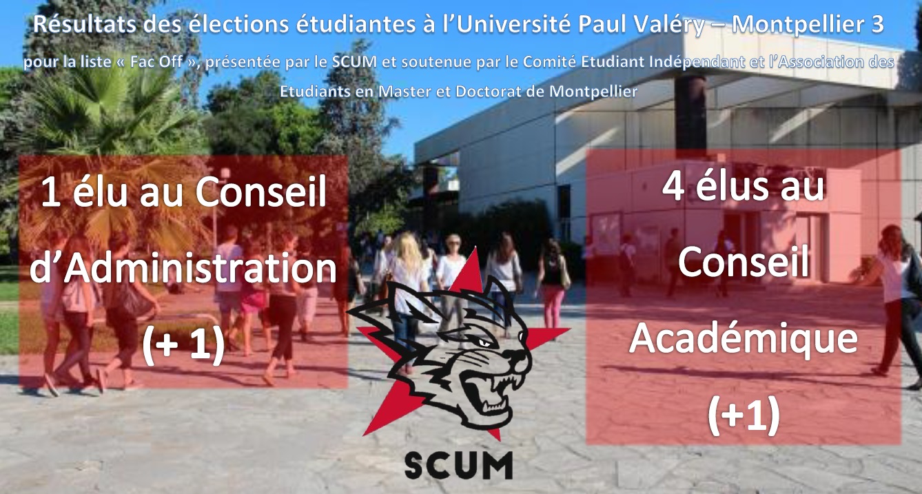Dans ce contexte, ou certains responsables administratifs appelaient ouvertement à voter contre nous jusqu’aux abords du bureau de vote, notre liste indépendante “Fac Off”, menée avec le Comité Etudiant Indépendant et l’Association des Etudiants en Master et Doctorat de Montpellier, était l’unique à s’opposer ouvertement à la présidence de l’université, en relayant les revendications du mouvement étudiant dont celle de la démission de Patrick Gilli. Seule liste à présenter un bilan complet de nos actions au cours des dernières années, nous avons eu la surprise de constater une curieuse “union sacrée” entre trois autres listes : “votez pour n’importe qui mais pas pour le SCUM”. Si voir les parisiens du Bureau National de la fantomatique UNEF délivrer le même discours que la liste de l’ADEM3/AGEM était surprenant, l’attitude de la liste “Solidaires Etudiant-e-s” l’était certes beaucoup moins : par exemple en septembre, certains membres de cette liste, avaient directement participé à la répression contre notre syndicat en section disciplinaire.