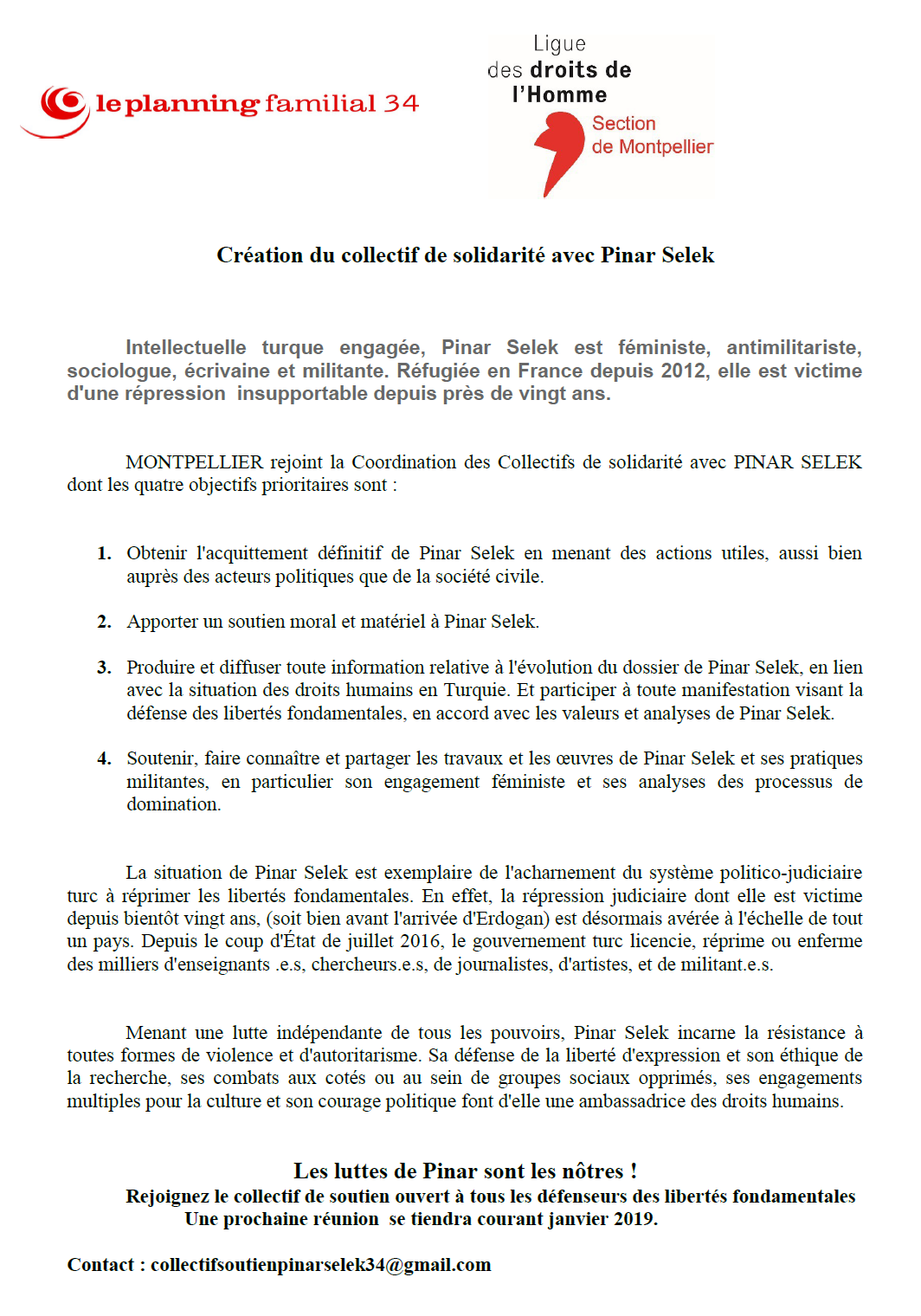 Ce mercredi 21 novembre s’est donc créé le collectif de solidarité avec Pinar Salek 34, afin que les luttes de Pinar soient connues de tous. Les luttes de Pinar sont les nôtres !