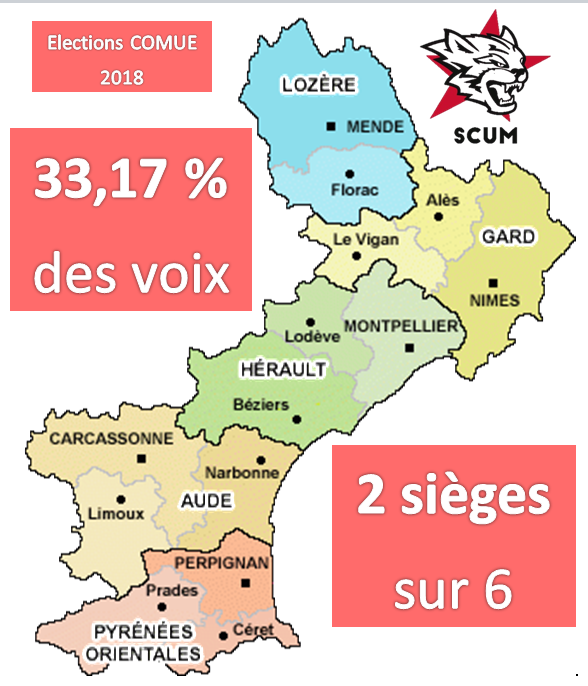 Mercredi 28 novembre 2018 se déroulaient les élections du Conseil d’Administration de la COMUE-LR (Communauté d’Universités Languedoc-Roussillon). Avec plus de 33% des voix sur l’ensemble des établissements d’enseignement supérieur de l’académie de Montpellier, notre liste “Étudiants Associatifs et Combatifs pour la COMUE” remporte 2 sièges sur 6 au Conseil d’administration de la Communauté d’universités Languedoc Roussillon.