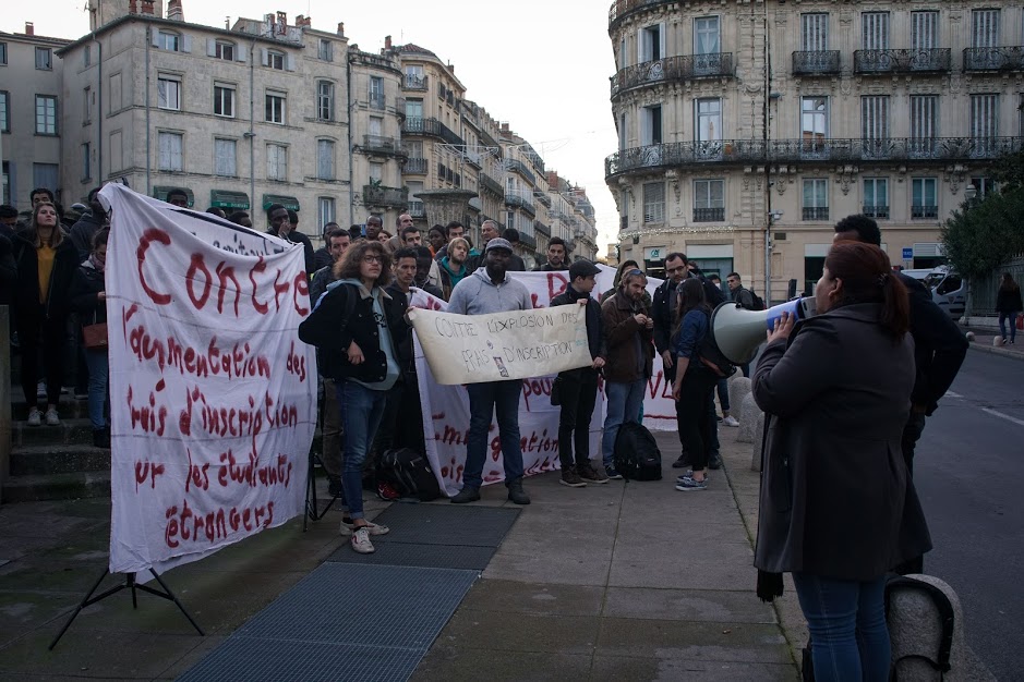 Les étudiants présents ont témoigné de leurs difficultés financières et de l’impossibilité pour eux de pouvoir continuer leurs études en France si cette hausse des frais d’inscription (2770€ la Licence et 3770€ le Master et Doctorat! ) était appliquée. Beaucoup d’interventions ont démontré que cette hausse des frais d’inscription était en réalité une véritable opération de sélection sociale par l’argent : les étudiants internationaux issus des couches privilégiées de leurs pays pourront toujours venir en France se payer des études. Le slogan « bienvenue en France », utilisé par le gouvernement pour promouvoir ses mesures prouve pour les différents participants le cynisme sous lequel est maquillée cette mesure discriminante et xénophobe. Un élu étudiant de notre liste “Fac Off” (Comité Étudiant Indépendant et SCUM) de l’université Paul Valéry a aussi pris la parole afin d’indiquer que grâce à la motion qu’il a déposé en CEVU (Conseil des Études et de la Vie Universitaire) le 20 novembre, l’université Paul Valéry Montpellier 3 a été la première université à rejeter la hausse des frais d’inscription pour les étudiants étrangers.