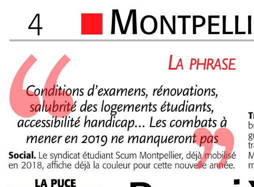 Sélection sociale, précarité, frais d’inscription, conditions d’examens, rénovations, salubrité des logements étudiants, accessibilité handicap … les combats à mener en 2019 pour la défense de nos droits ne manqueront pas ! Le SCUM, à vos côtés, continuera a agir au quotidien.