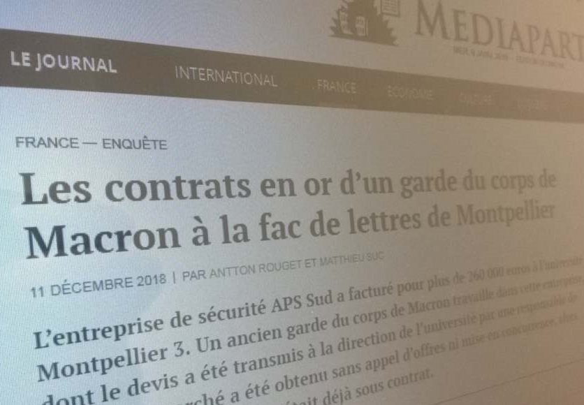 […] Le 11 décembre 2018, on apprenait que la milice privée embauchée par la présidence de l’université pour réprimer violemment les étudiants mobilisés au printemps dernier, l’avait été dans de curieuses conditions. Le journal Médiapart a en effet révélé que l’entreprise, proche d’Alexandre Benalla et d’Emmanuel Macron, avait été embauchée par l’intermédiaire de la responsable locale des « Jeunes Avec Macron ». Cerise sur le gâteau, les 260 000€ de contrat n’ont fait l’objet d’aucun appel d’offres ! Un beau cadeau qui a encouragé plusieurs associations (le syndicat SCUM et l’association anti-corruption Anticor 34) à signaler auprès du Procureur de la République, en janvier 2019, ces curieux contrats. Le SCUM est même allé jusqu’à déposer une plainte contre Patrick Gilli, président de l’université Paul Valéry, pour « détournement de fonds publics » et « favoritisme ». Depuis, une enquête a été ouverte sur ces malversations, et l’université a répliqué en déposant…. […]