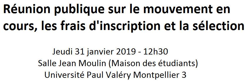 Jeudi 31 janvier, se tiendra, de 12h30 à 14h en salle Jean Moulin (maison des étudiants, université Paul Valéry Montpellier 3), une réunion d’informations organisée par le Comité Étudiant Indépendant et le SCUM, au sujet du mouvement social en cours et des mesures prises ou en cours d’application par le gouvernement et les directions d’universités vis à vis des étudiants (frais d’inscription, sélection en Licence et Master).