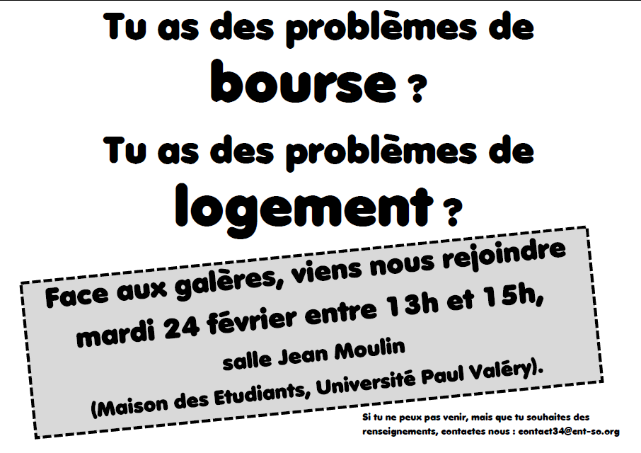 Face aux galères, viens nous rejoindre mardi 24 février entre 13h et 15h, salle Jean Moulin (Maison des Etudiants, Université Paul Valéry).