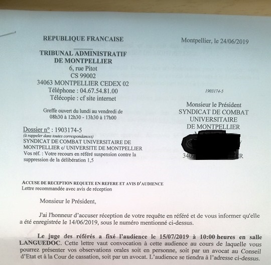 Le Syndicat de Combat Universitaire de Montpellier (SCUM) avait entamé le 14 juin une procédure juridique contre l’Institut Montpellier Management (MOMA, composante de l’Université de Montpellier). Nous avions déposé un Recours en Excès de Pouvoir afin de contester la légalité de la suppression de la “délibération 1.5”, qui permettait un calcul plus favorable pour les étudiants de leur moyenne universitaire. Parallèlement et au vu de l’urgence de la situation, nous avions aussi entamé une procédure d’urgence, appelée Référé Suspension, afin d’obtenir une audience rapide afin de suspendre cette modification subite des règles relative aux examens.