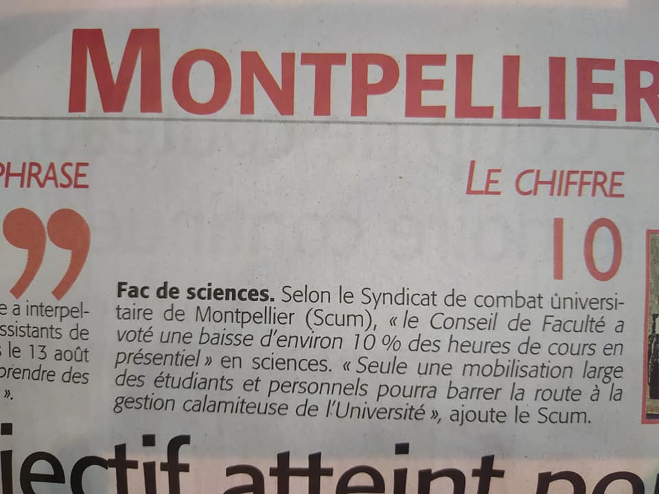 Comme nous l’avons indiqué à Midi Libre, pour le SCUM, “seule une mobilisation large des étudiants et personnels pourra barrer la route à la gestion calamiteuse de l’Université de Montpellier”.