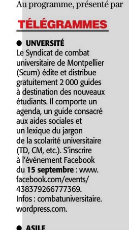 Brève du journal Midi Libre du 13 septembre 2019 relayant la distribution de notre guide d’aide aux étudiants :
