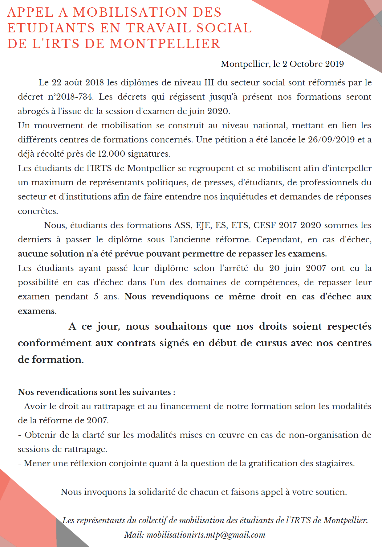 Aux côtés des étudiants des IRTS mobilisés, le Syndicat de Combat Universitaire de Montpellier (SCUM) relaie les revendications nationales (droit au rattrapage, informations claires sur les modalités d’examens et redoublement, gratification des stages).