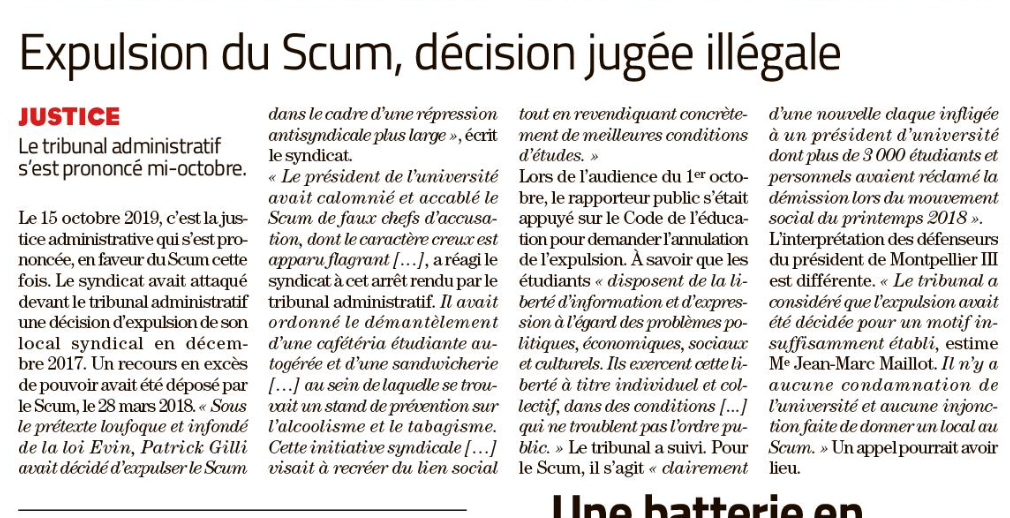 En date du mardi 15 octobre 2019, le Tribunal Administratif de Montpellier a annulé la décision du président de l’Université Paul-Valéry Montpellier 3 du 20 décembre 2017 expulsant le Syndicat de Combat Universitaire de Montpellier (SCUM) de son local syndical. Le verdict est implacable concernant la répression anti-syndicale visant le SCUM opérée par Patrick Gilli : l’intégralité des conclusions présentées par la direction universitaire sont rejetées par le tribunal. Alors que dans le recours en excès de pouvoir déposé par le SCUM le 28 mars 2018, nous nous sommes appuyés sur une abondante jurisprudence, la justice va plus loin dans sa condamnation de la politique de répression et de harcèlement anti-syndicale. En effet, dans ses conclusions rendues lors de l’audience du 1er octobre 2019, le rapporteur public s’est appuyé sur l’article L811-1 du Code de l’éducation pour demander l’annulation de l’expulsion du local syndical. En s’appuyant sur cet article, le rapporteur public confirme que les actions syndicales menées par le SCUM avant l’expulsion de notre local ne sont pas constitutifs d’un trouble à l’ordre public justifiant cette expulsion. Ainsi, les actions menées par le SCUM se trouvent ainsi légitimées comme faisant partie d’une démarche syndicale classique : mise en place d’une cafétéria autogérée étudiante, stands d’information syndicale ou encore les diverses actions d’occupation des conseils centraux de l’université. Nous précisons aussi qu’à cette victoire juridique s’ajoute une victoire d’étudiants contre l’institution universitaire. En effet, notre affaire n’était pas plaidée par un avocat, mais par un des élus étudiants que Patrick Gilli avait convoqués en section disciplinaire. Il s’agit clairement d’une nouvelle claque infligée à un président d’université dont plus de 3000 étudiants et personnels avaient réclamé la démission lors du mouvement social du printemps 2018.