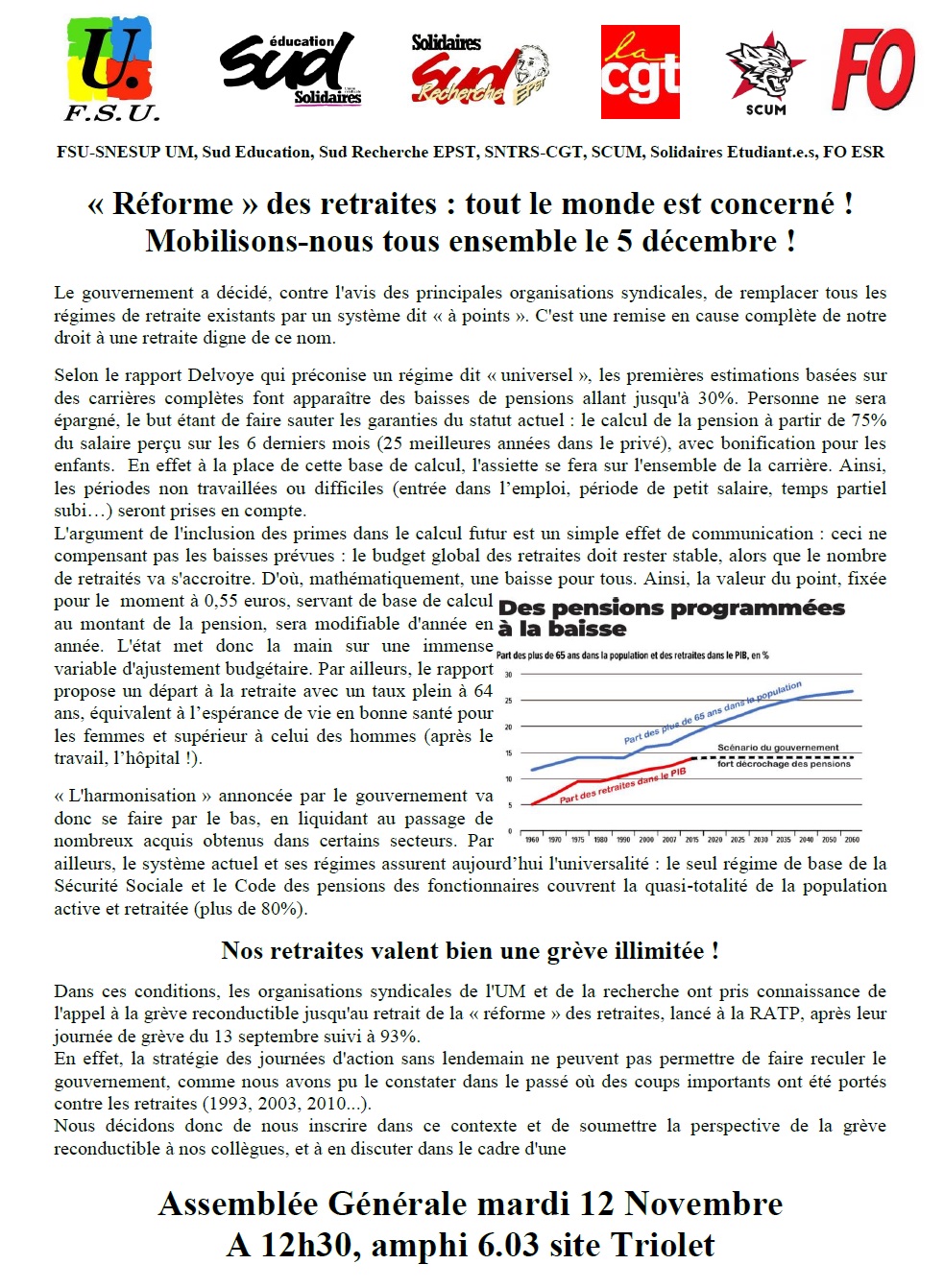 Le 05 décembre 2019, est prévue une grève générale contre la réforme des retraites. Alors que la précarité rend souvent nos vies quotidiennes de moins en moins vivables, accentuée par une sélection de plus en plus drastique en Licence et Master, nous proposons de se réunir en comité d’action, ouvert à toutes et tous, afin d’organiser concrètement les futures actions et mobilisations.