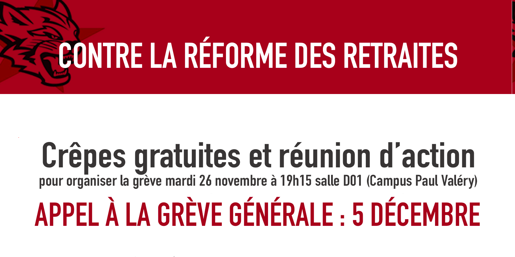• Mardi 26 novembre à 19h15, salle D01 de l’université Paul Valéry : comité d’action pour organiser mobilisations et grève.