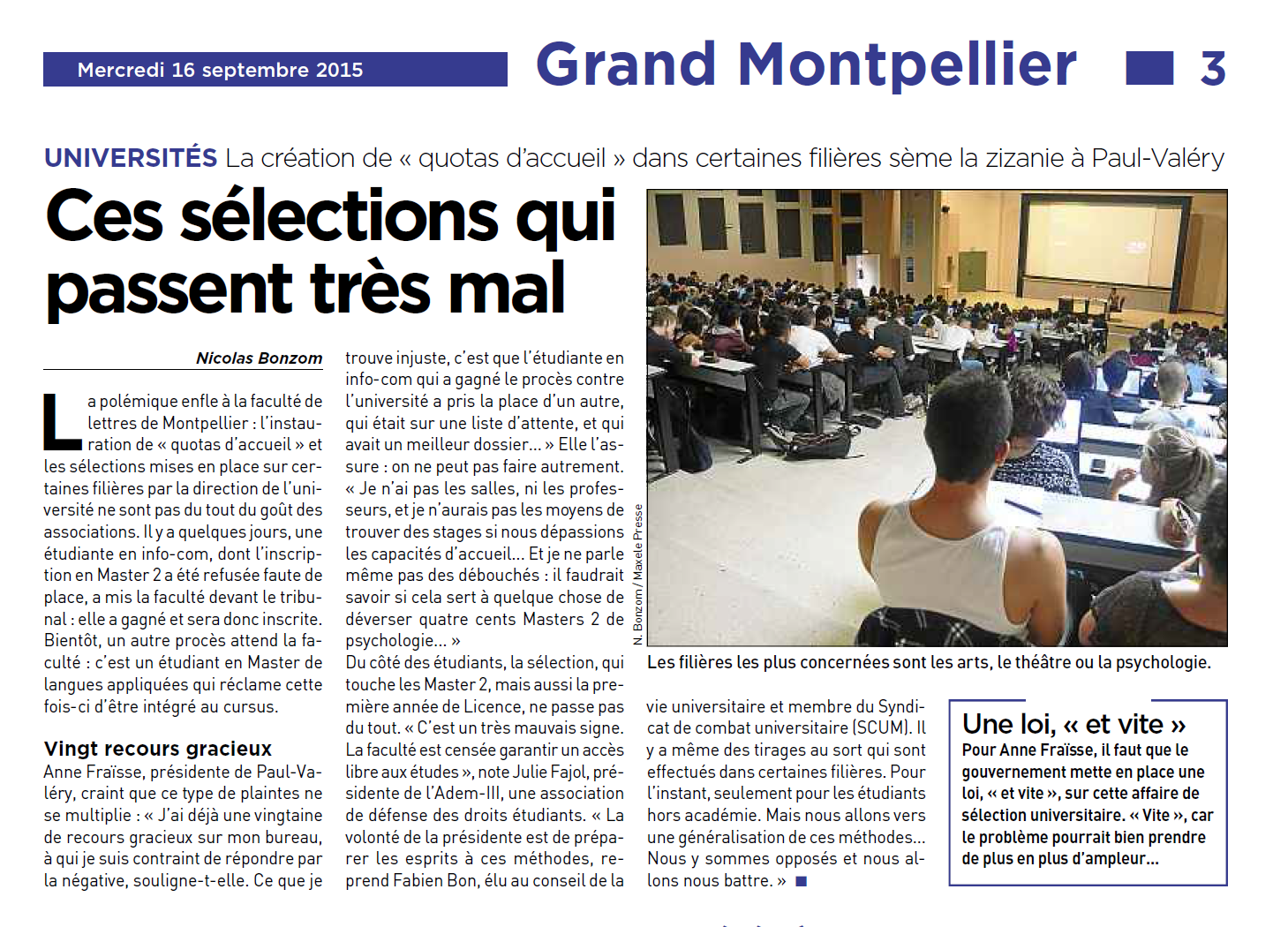 Ce mercredi 16 septembre, le journal 20 Minutes Montpellier a interviewé le Syndicat de Combat Universitaire de Montpellier (SCUM) concernant les quotas d’accueil mis en place à l’Université Paul Valéry.