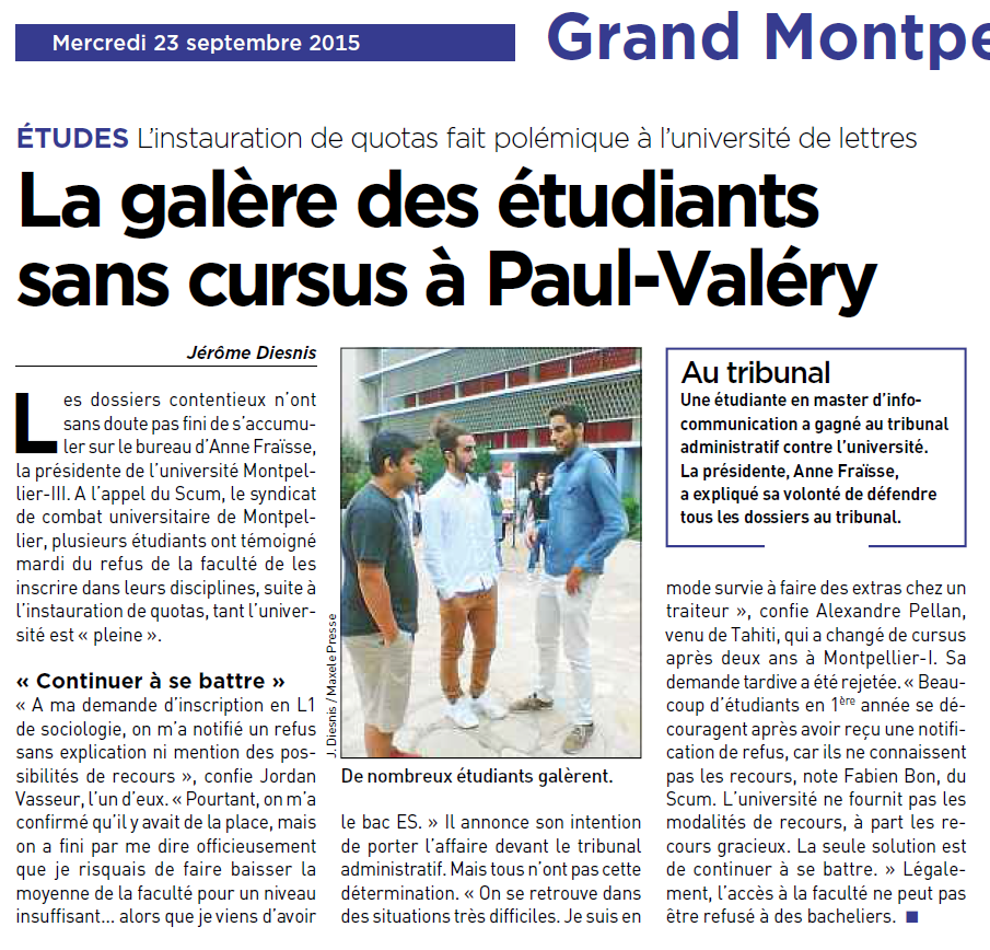 A l’occasion du rassemblement de ce mardi 22 septembre contre la sélection illégale à l’inscription qui est pratiquée par l’Université Paul-Valéry, plusieurs “sans-fac” ont témoigné auprès des médias de la situation intolérable dans laquelle ils sont maintenus par la politique menée par la présidence de l’université. Le Syndicat de Combat Universitaire de Montpellier (SCUM) a clairement exprimé, comme la semaine dernière, sa volonté de continuer se battre afin de mettre fin à cette politique de sélection.