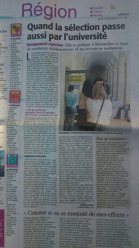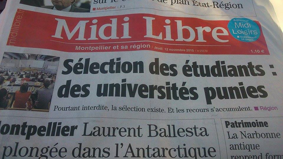Dans son édition du jeudi 12 novembre, le journal Midi Libre a réalisé un dossier sur la sélection à l’inscription pratiquée par les universités à Montpellier. Interviewé par ce journal, le Syndicat de Combat Universitaire de Montpellier (SCUM) a tenu a rappeler la responsabilité directe de la direction de l’Université Paul-Valéry – Montpellier 3 dans cette situation.