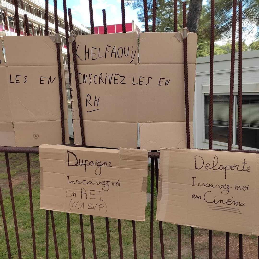 Au final, comme ce sont les enseignants directeurs de Master et les présidences d’université qui disposent du pouvoir d’inscrire les étudiantes et étudiants, les étudiants sans-Master soutenus par le SCUM ont décidé de demander leur inscription directement auprès de ceux-ci. Si à la Faculté des Sciences de l’Université de Montpellier, la direction de l’établissement s’est engagée à proposer au moins une inscription en Master aux étudiants initialement refusés, il en a été différemment à l’université Paul Valéry Montpellier 3. Dans cette université, les étudiantes et étudiants sans master se retrouvent confrontés au mépris de certains enseignants, avec l’imposture politique en supplément. A titre d’exemple, la directrice du Master Cinéma et autrice d’un article scientifique intitulé « Genres vs auteurs : lutte des classes et choix stratégiques en études cinématographiques » (Chloé Delaporte), et qui n’hésite pas à affirmer à un étudiant précaire sans Master : “oui, j’ai la possibilité de t’accepter, mais je n’ai pas envie de le faire”. Si elle parle autant de lutte des classes, c’est probablement parce que cette enseignante a désormais fait le “choix stratégique” d’être du côté des dominants. Et elle l’assume de façon honnête et odieuse, poussant même l’indécence jusqu’à carrément tenter de se faire passer pour la victime de la sélection qu’elle met elle-même en place ! Quand le vernis progressiste de prestigieuses publications se craquelle, c’est finalement le Darwinisme social le plus exacerbé que l’on retrouve. Notons cependant que plusieurs enseignants ont répondu favorablement aux démarches du SCUM et des étudiants sans-Master, ce qui accentue le contraste avec la mauvaise foi de leurs collègues.