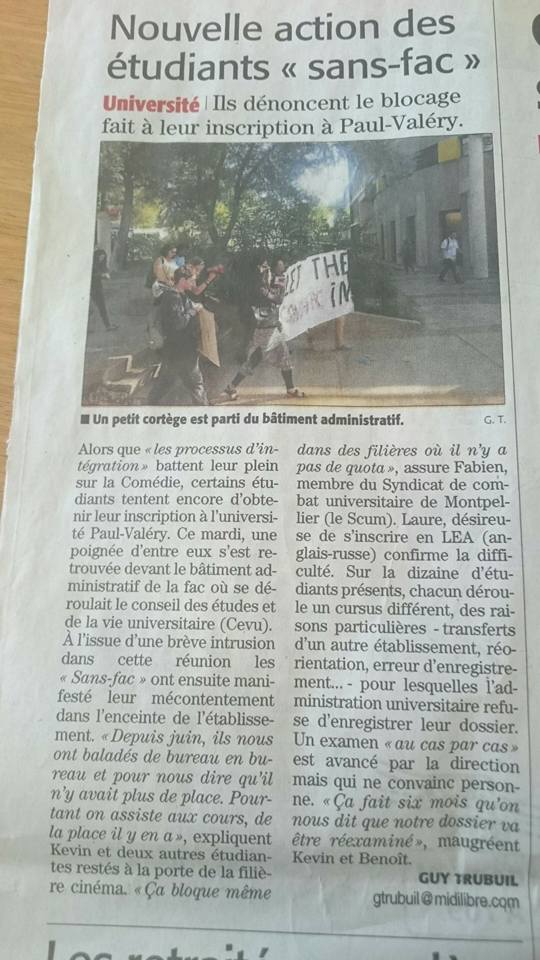 Malgré les promesses non-tenues, les mensonges et les menaces, nous continuerons à soutenir les sans-fac dans leur lutte pour leur inscription au sein de l’Université Paul Valéry. Plus largement, nous continuerons à nous battre contre la sélection illégale pratiquée par la direction de l’université, en convergence avec les luttes plus globales contre la précarité.
