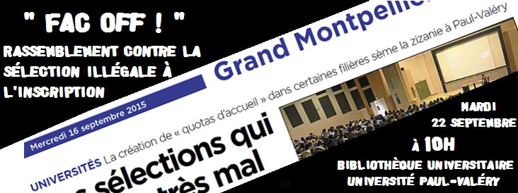 Rassemblement lundi 1er février à 10h, devant l’entrée du bâtiment administratif « Les Guilhems », de l’Université Paul Valéry – Montpellier 3. Communiqué détaillé sur la situation : Une escroquerie à l’inscription payante à l’Université Paul-Valéry – Montpellier 3 ? En septembre 2015,…