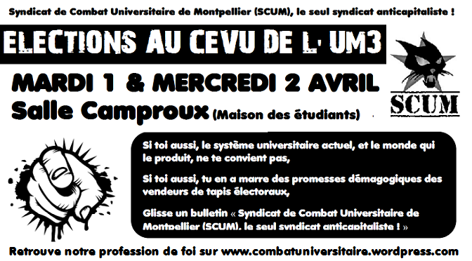 Le Syndicat de Combat Universitaire de Montpellier vous propose, jeudi 27 mars de 8h30 à midi, du café et du thé à prix libre devant l’amphi A de l’Université Paul-Valéry. Les « tables thé/café » du SCUM, moments de convivialité et de…