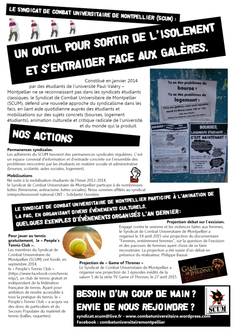 Problèmes d’inscription ? De bourses ? De logement étudiant ? Ou tout simplement envie de nous rencontrer? Le Syndicat de Combat Universitaire de Montpellier (SCUM) tiendra un stand de permanence syndicale devant l’entrée de la bibliothèque universitaire de l’Université Paul-Valéry,…